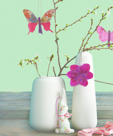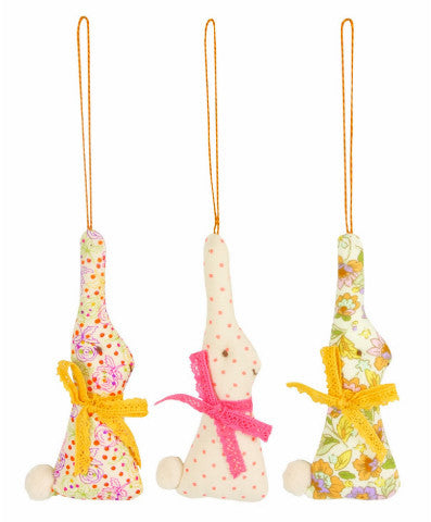 Have fun decorating all year round with this set of three adorable baby bunnies! Crafted from fine cotton, you will fall in love with these romantic floral/dotted prints. Each bunny has a ribbon embellishment. They hang from a matching string.