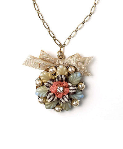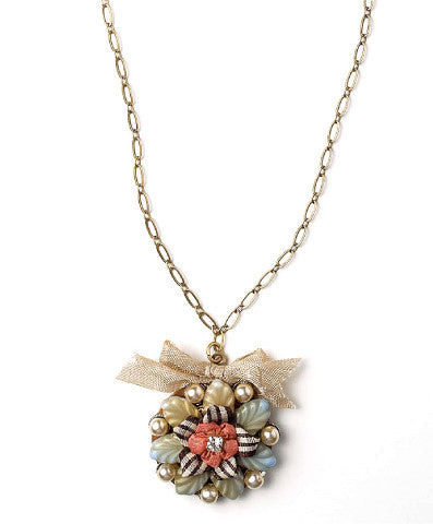 Cast glass leaves, faux pearls, a rhinestone rayon bow and a cast antique gold plated finding form this romantic pendant that hangs from an oval link antique gold plated chain.